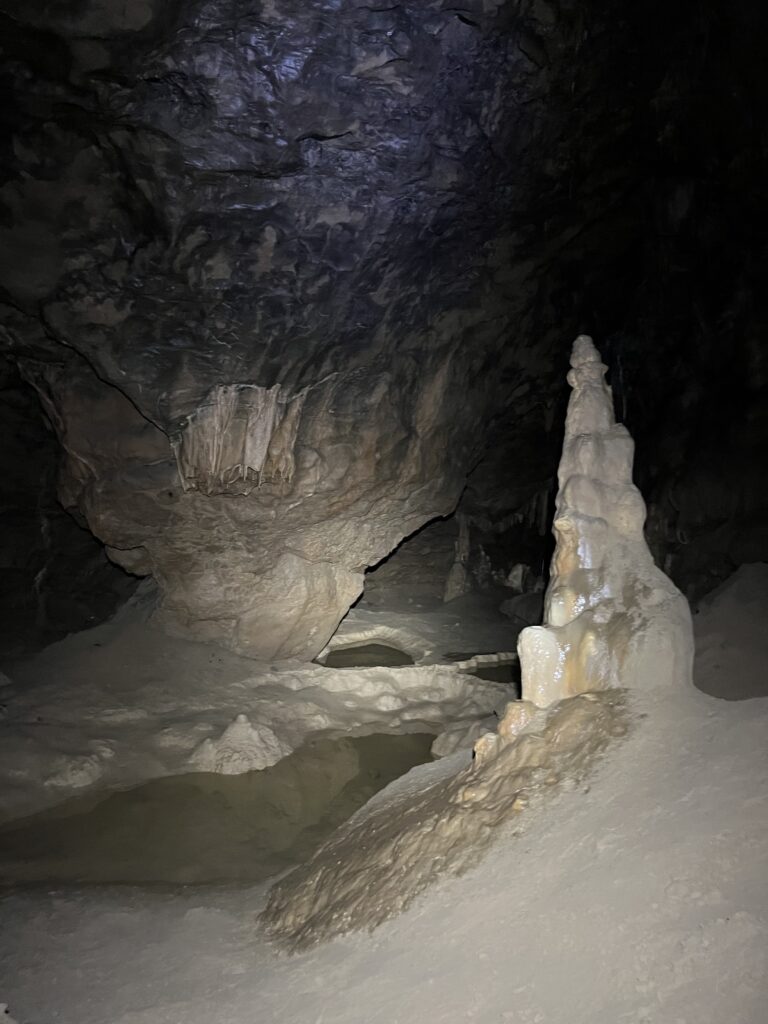 Descenderemos por un pozo de 12 metros de para bajar al piso inferior e iremos avanzando y viendo las diferentes formaciones de la cueva hasta volver a subir por otro pozo de 6 metros.